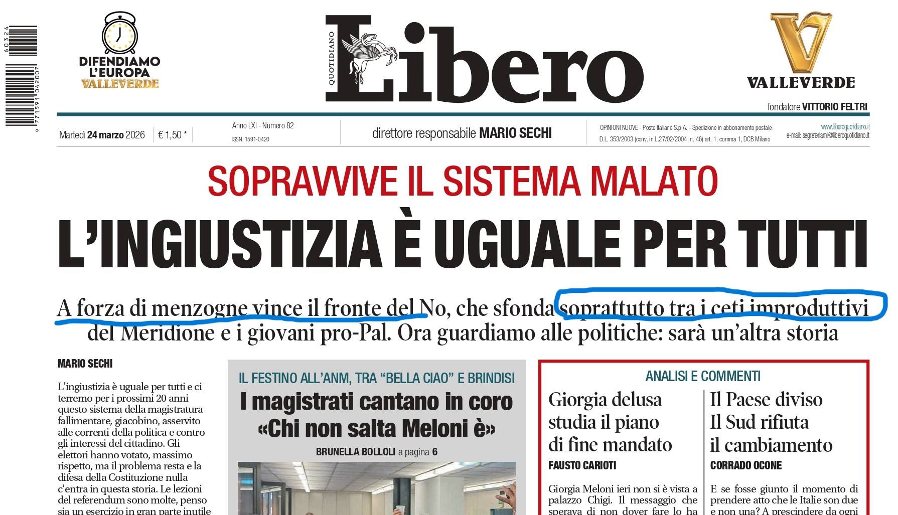 Che poi questo sia stato forse il Referendum più politico della storia, con la proposta molto debole di una riforma costituzionale caricata eccessivamente di messaggi dallo stile “O con me o contro di me” (ormai immancabili dalla perenne gestione della cosa pubblica in emergenza fra crisi, pandemie e guerre), lo dimostrano i demenziali giornalai al seguito del governo di questi due giorni post referendum. Dai quotidiani locali dei soliti noti (“La Tuscia sta con il centrodestra, si al 54%” – Corriere di Viterbo per la serie “confessioni da melodramma radiofonico”) fino al inqualificabile Mario Sechi direttore di Libero (e noi che pensavamo che il peggio del peggio fosse Littorio Feltri…) la cui prima pagina di martedì non ha bisogno di commenti ma la sola constatazione che tutto sommato l’ha presa bene, come si suol dire.